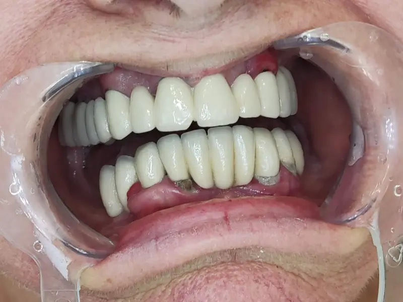Pronounced periodontopathy, present old wobbly bridge with purulent processes and extreme lack of bone in the upper jaw