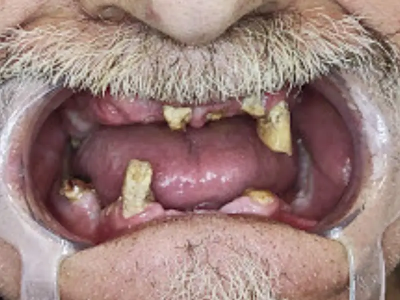 Together with Janez, we made a plan to remove all existing teeth, remove the cyst and place implants in one act. When the time came for the procedure, we placed an artificial bone on Janez. In order not to immediately burden the structure, in this case, due to the condition, Janez did not receive temporary teeth immediately. After 4 months, we made Janez a definitive work, i.e. a hybrid bridge.